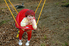The biggest preconception she’s radically challenged is the age at which an individual can create novel ways of communicating. We’ve been using baby signing with L, and she’s picked up on several signs that she uses regularly now: eat, more, and bath are among them. She understands a lot more — sleep, drink, potty/diaper change — but that’s not terribly impressive in that she already understands a great deal of spoken language. What shocked me recently about the signing was that L created her own sign for a word that she understands: swing. She waves her right arm back and forth at about shoulder level when she wants to go swing — which is pretty much constantly.
