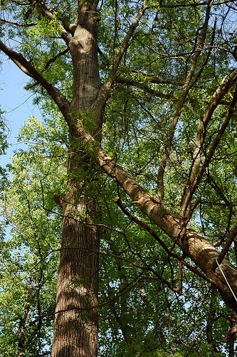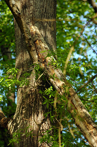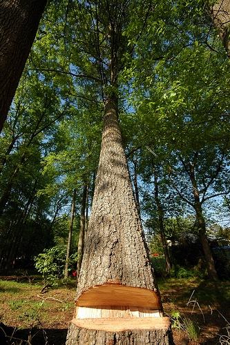Today, I took care of the problem, but not without some trepidation. As it stood — or rather, half-stood — I didn’t know which way it would finally fall. Cutting from the bottom seemed most logical: eventually, gravity would serve to create a fulcrum out of the weakened part of the tree, pulling it in on itself.