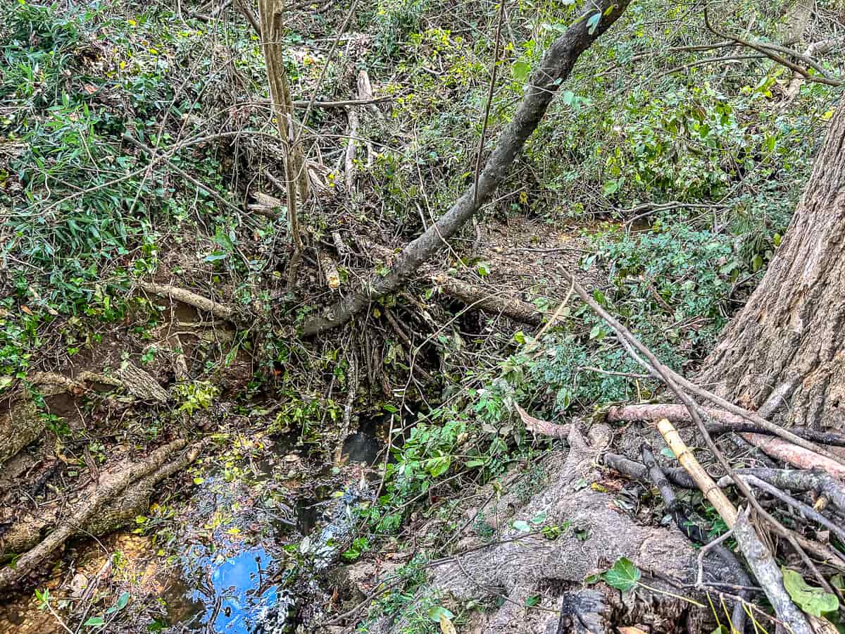 On our property, I worked today to remove the dam of debris that formed in our backyard creek. It was about five feet high and seemed like it would completely block the water the next time we had a heavy rain — so it had to go. I’ll finish it up tomorrow.
