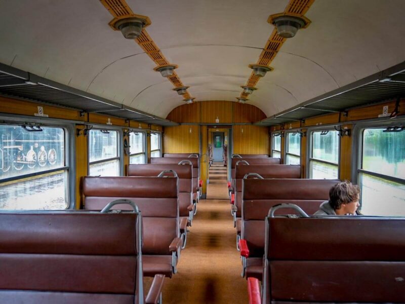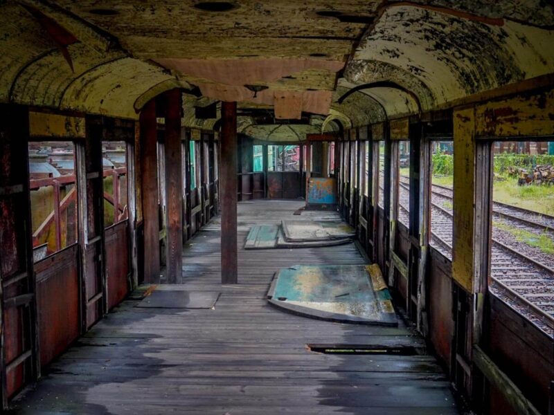We talked about the fact that all this equipment was once new, modern, and cutting-edge. We entered an empty passenger wagon that had nothing but a wooden floor and rusted ceiling: